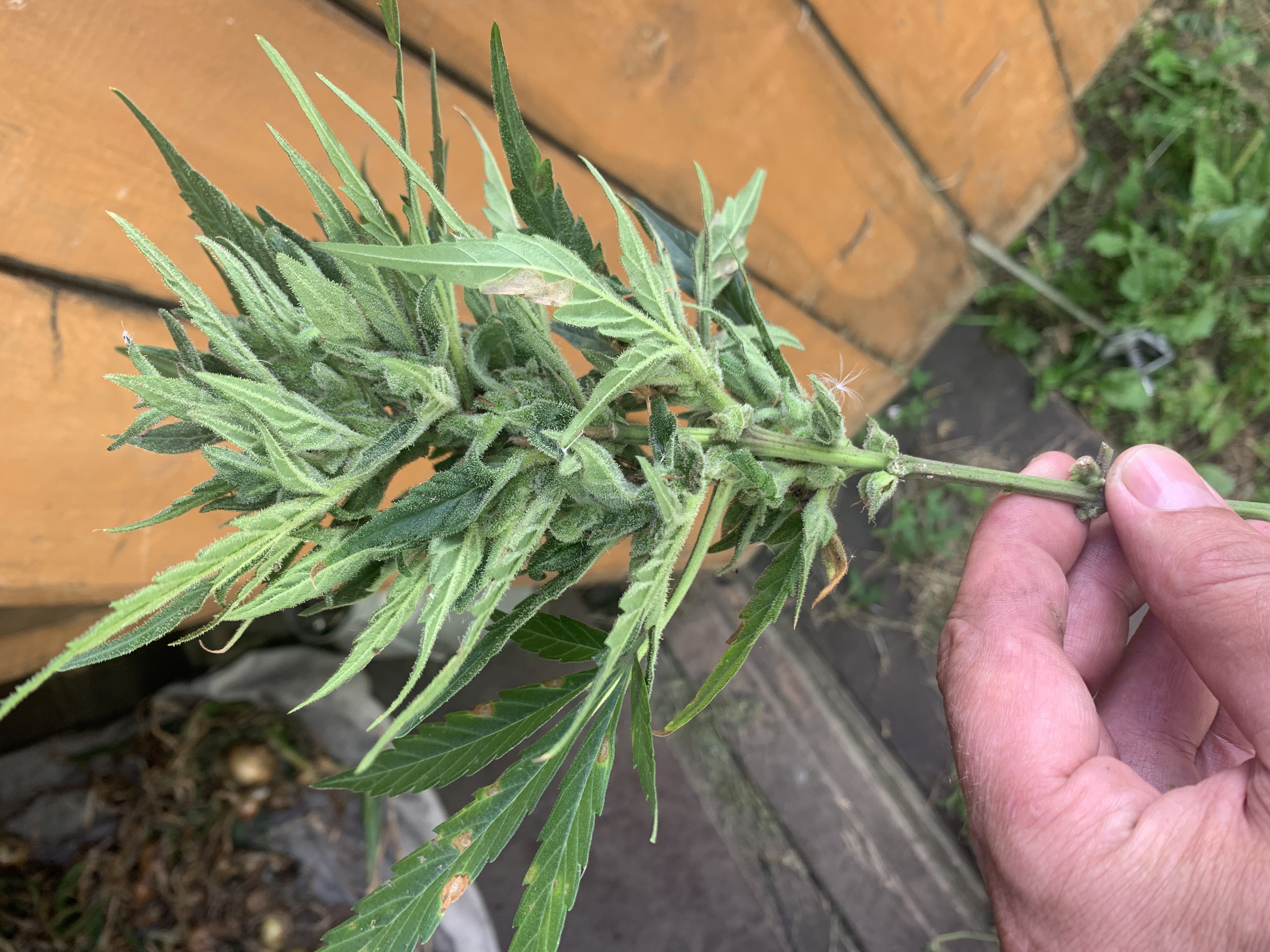 Впечатления и положительные и в то же время печаль, из положительных сорт еще не отцвел но очень хороший по качеству , а печаль бабушка срубила тяпкой случайно , пришлось скуривать зеленым ! Самая интересное то , думал почему карликом растет по отношению к другим сортам , который корень остался в земле думаю дай вырву посмотрю , оказывается когда перегной в лунку кидал гнилая деревяшка попалась , так вот корень прям врос в нее не смог вырвать ! Деревяшка размером с футляр от очков! Ну а как созрел смотри по фото , так вот с двух разматывает с толлером ! Снизу уже обрезал курил
